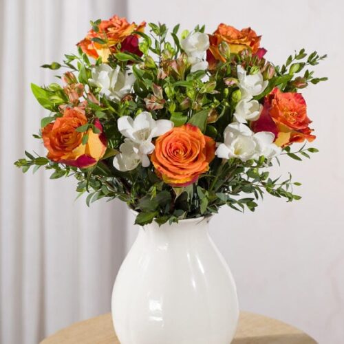 Celebrate the colours of autumn with a bouquet of sunset orange Roses, elegant white Freesias and vibrant coral Florinca Alstroemeria. A perfect gift for embracing the beauty of autumn.