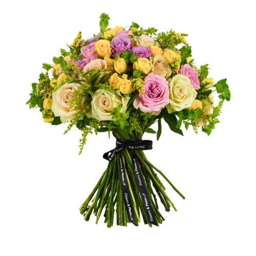 A radiant bouquet that captures the warmth of late summer afternoons. Velvety roses and delicate spray roses are lifted by clouds of golden solidago and the airy, jade-green stems of bupleurum
