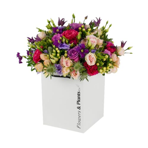 A richly textured seasonal bouquet with real depth and drama. Full roses and ruffled spray roses sit alongside velvety eustoma, bold thistles, jewel-toned hypericum berries and trailing clematis, all woven through with lush seasonal foliage and softened with the blush of carnations.